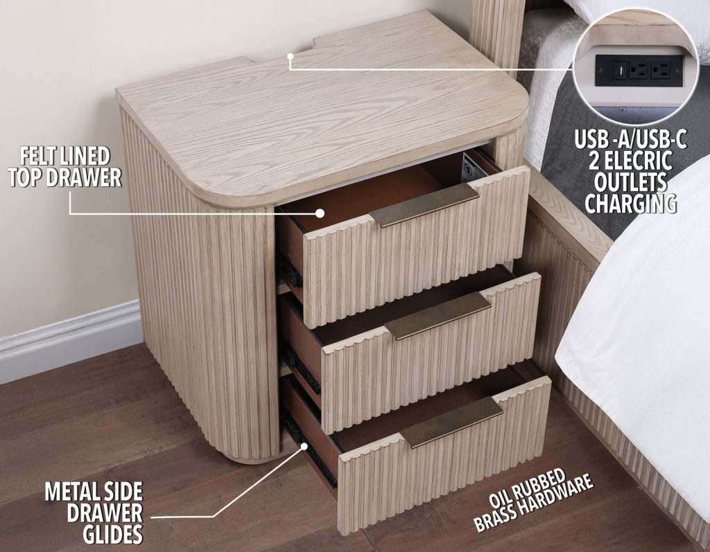 The Henry King 4-Piece Set blends clean, modern style with softer touches like rounded corners and reeded fronts. The king bed serves as a cozy anchor with its inviting headboard and warm espresso finish. The 6-drawer dresser and matching mirror pair sleek design with practical storage, featuring oak veneers and oil-rubbed brass pulls. The nightstand adds thoughtful functionality, offering USB ports, outlets, and a felt-lined drawer. Finished in a light tan tone, this set brings a fresh, stylish look to any bedroom.